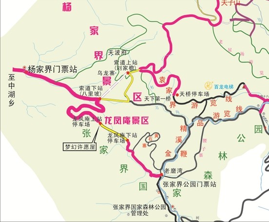 龍泉瀑布-楊家界風(fēng)光3、中湖門票站進(jìn) 中湖門票站——索道下站八里坡停車場:(乘車)15分鐘