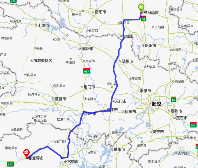 左右,沿途經過駐馬店——隨州——天門市——潛江市——荊州——常德(也可以走國道經澧縣、石門縣)——慈利——張家界。
