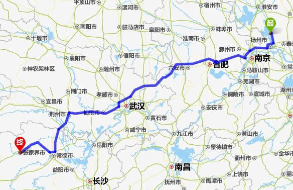 左右,沿途經過高郵——揚州市——滁州市——合肥——六安市——麻城市——仙桃市——潛江市——荊州市——常德市(這里可以不走常德,直接從荊州經澧縣、石門縣到慈利縣)——慈利縣——張家界。