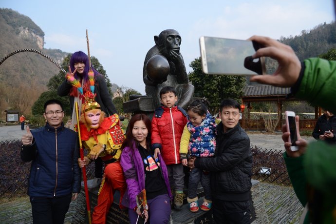 手持金箍棒,頭戴紫金冠。2月2日,農(nóng)歷臘月二十四,中國傳統(tǒng)小年節(jié)氣。當天下午,旅游勝地張家界武陵源黃龍洞景區(qū),一名“美猴王”打扮的特殊游客現(xiàn)身“后天”雕塑、龍宮大廳、花果山等景點,其惟妙惟肖的“孫悟空”動作表演,不時引來其他游客的驚呼:大圣歸來!