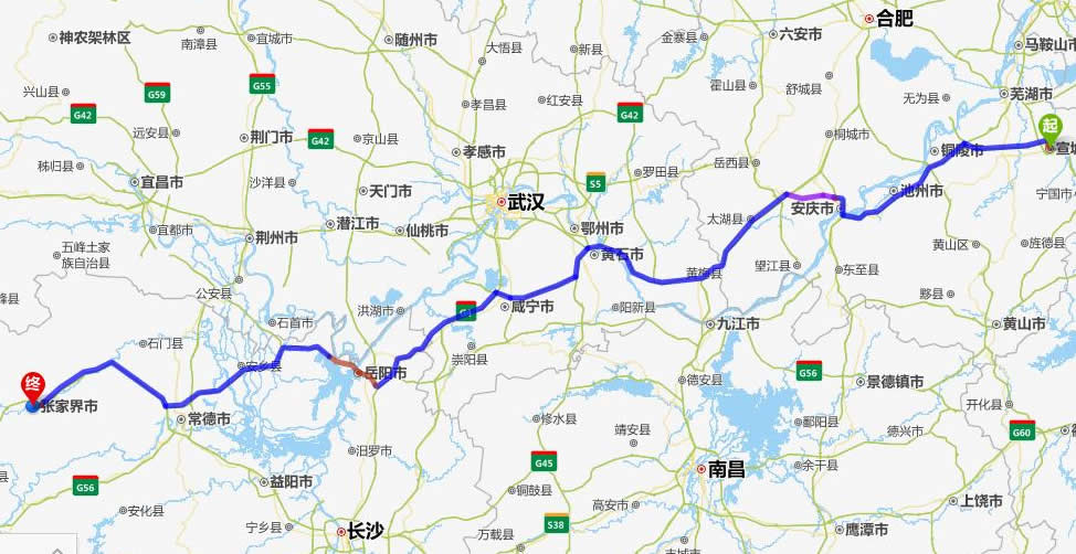 左右,沿途經過宣城市——銅陵市——池州市——安慶——太湖縣——黃梅縣——黃石市——咸寧市——岳陽市——安鄉(xiāng)縣——常德市——慈利縣——張家界。